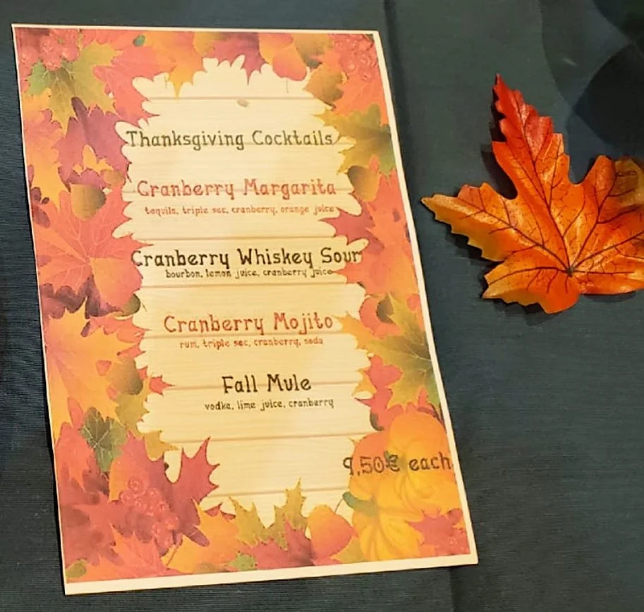 Like any good pub, the first thing they did was ask for our drink orders. Aside from the usual alcoholic offerings, they had special Thanksgiving cocktails.
