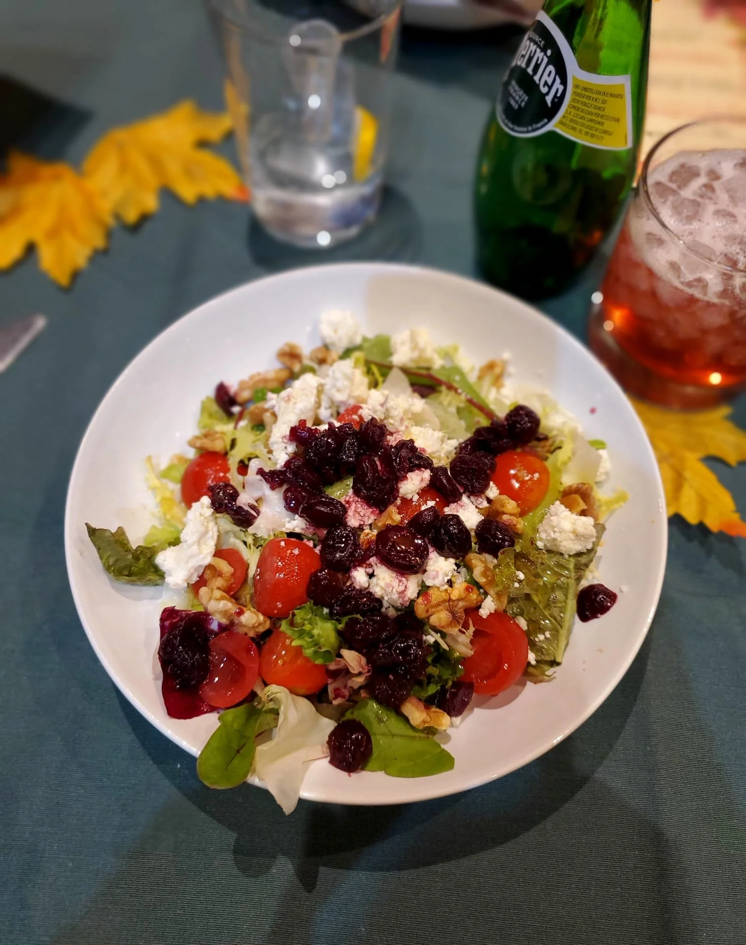 First, a goat cheese salad with roasted cranberries in red wine, walnuts and citrus vinaigrette.