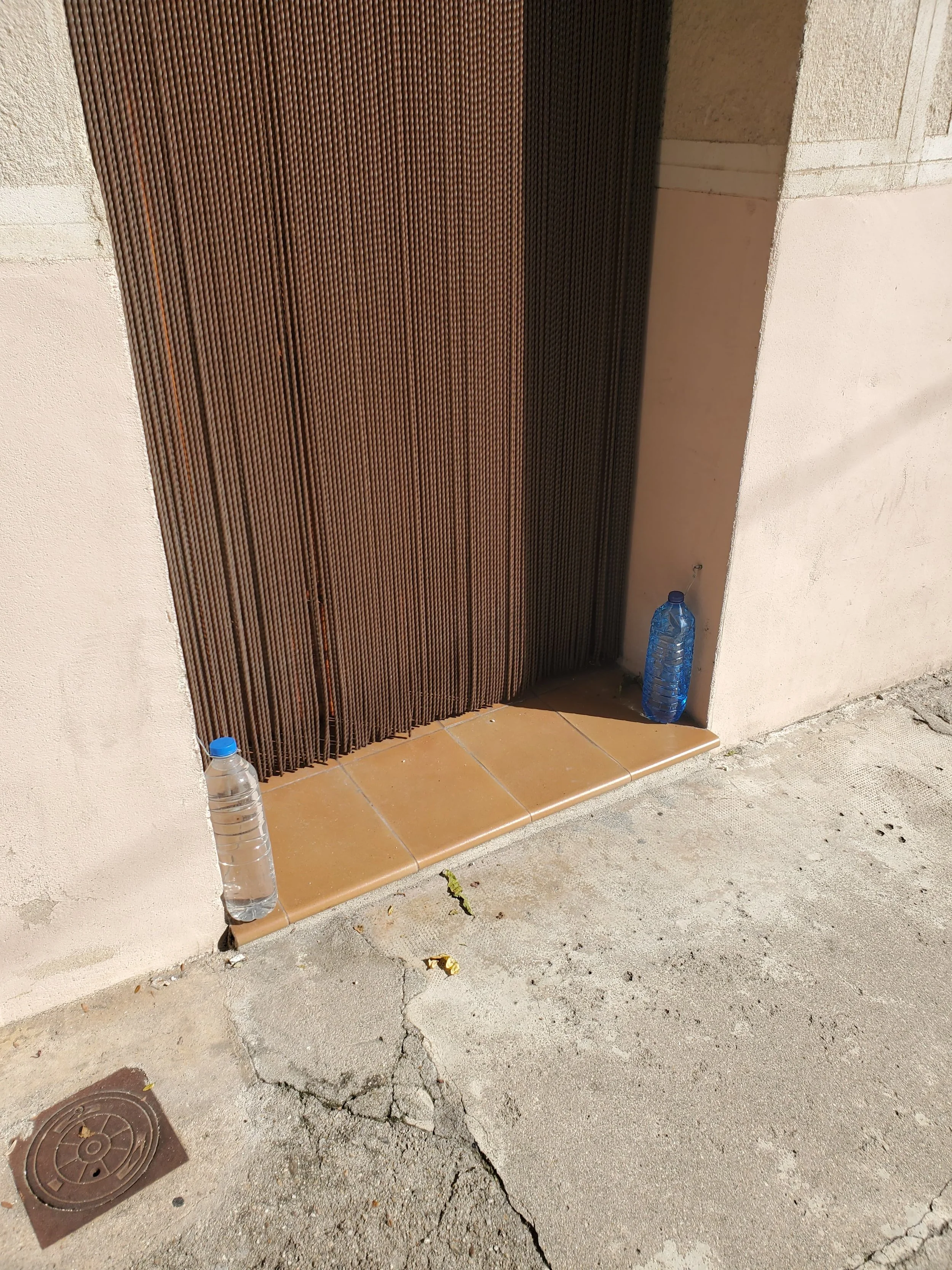 I also learned about the custom of placing a bottle or two of water in the doorway of houses to prevent cats and dogs from peeing on your front step (apparently they do this in other countries, too, like Japan and Italy).