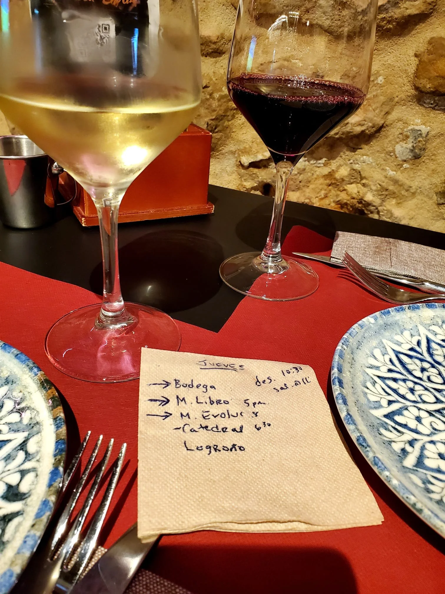 About 15 minutes later, the doors opened. (Did they see us lurking and open early for us?) We had tapas and local red wine (Vizcarra), which was delicious, while we planned the next leg of our trip.