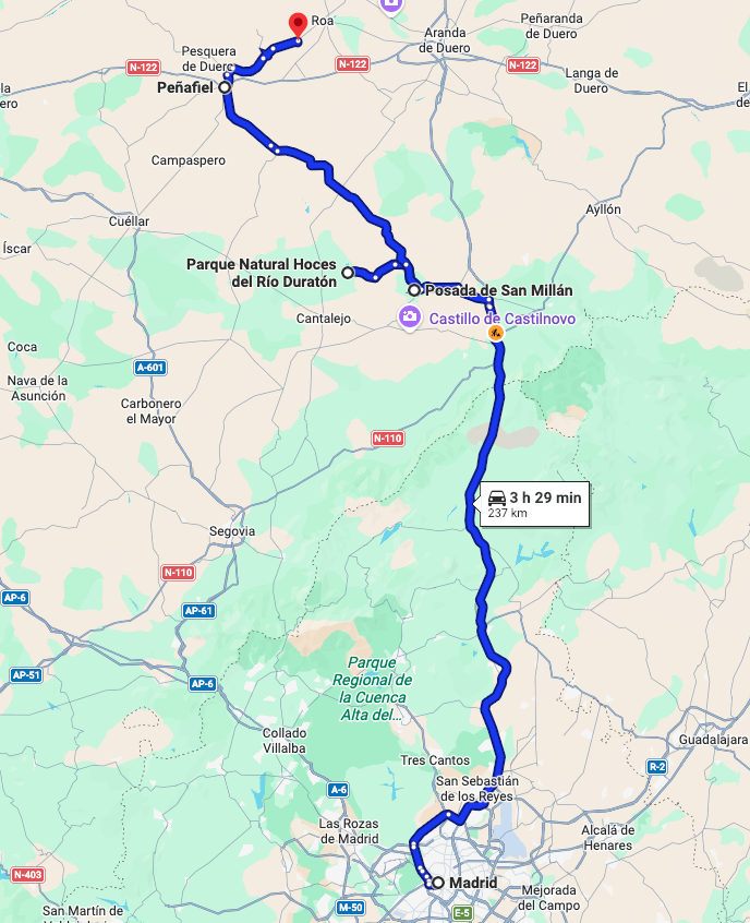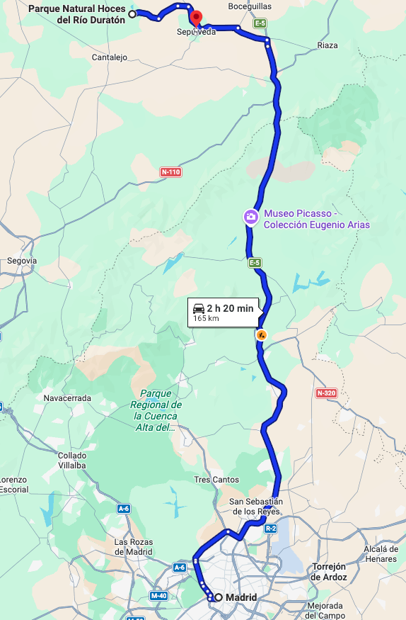 About two hours (and 150 km/93 miles) later, we arrived in Parque Natural de las Hoces del Río Duratón (Duratón River Gorge Natural Park) in the province of Segovia, Spain.